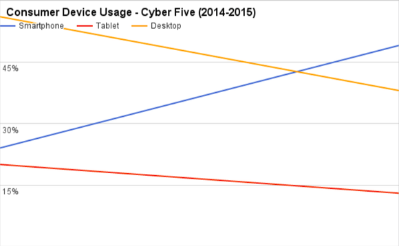 Analysts at comScore said spending via mobile device surged 53% to $838 million, or 27% of Cyber Monday's total. MasterCard's ChannelAdvisor report says smartphones were the primary device used, accounting for almost half of all traffic, more than double the year before, while tablets went from accounting for a fifth of traffic last year to just 13% this year. Desktop computers are quickly fading, falling from 56% of the traffic generated to 38%, which means the money retailers like Target spent in upgrading their systems to better handle mobile was money well spent.
