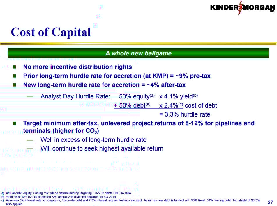 Kinder Morgan will defend its investment-grade credit rating, and won't issue equity at unattractive terms, because either choice would weaken the company. Instead, it's simply going to invest from a position of strength, which means it needs to divert cash that it was intending to pay to shareholders, and use it to invest in its compelling backlog of fee-based, demand-driven projects -- a backlog that the company expects to create long-term value due to the strong project-level economics, which are simply too good to pass up.