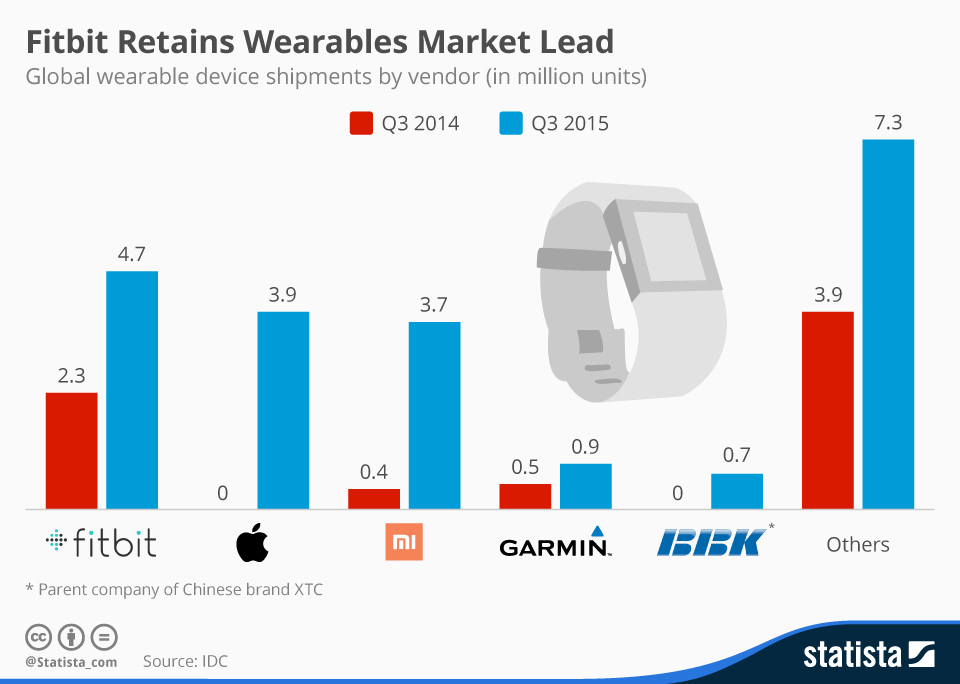 Fitbit sales in the third quarter rose to 4.7 million wearable devices shipped, more than twice that of 2014's Q3, keeping it firmly entrenched as the top dog. To Apple's credit, its second quarter of Watch availability ended with 3.9 million units shipped, earning it 18.6% of the market. To put that into perspective, Fitbit boasts 22.2% of all wearable sales, down slightly from the previous quarter, just as Apple's market share was.