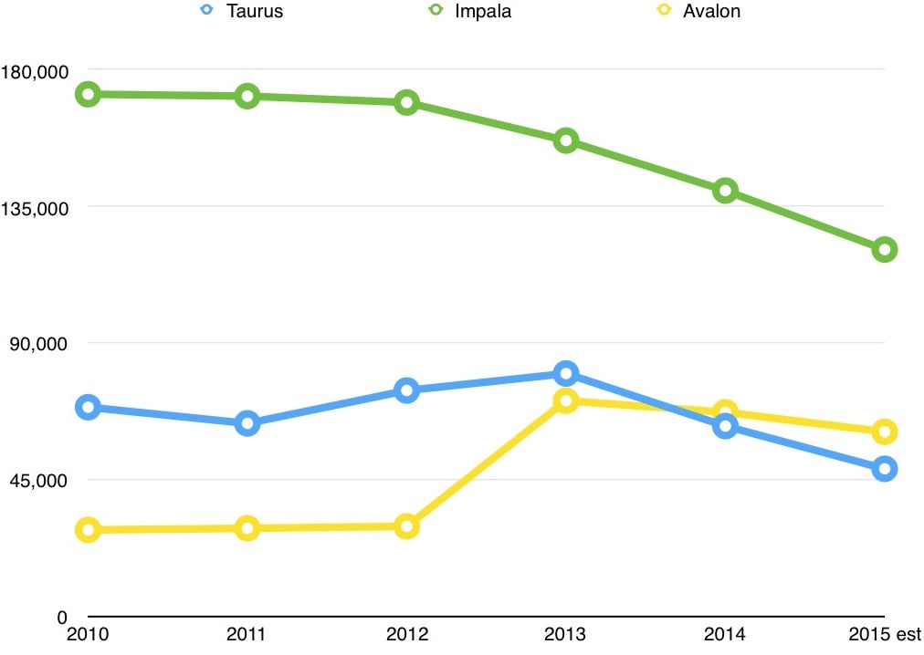 The Taurus isn't the only big sedan that's languishing on dealer lots right now. Two of its key rivals, General Motors (GM 0.78%) Chevrolet Impala and Toyota's (TM 1.31%) Avalon, have also seen big sales declines in 2015.