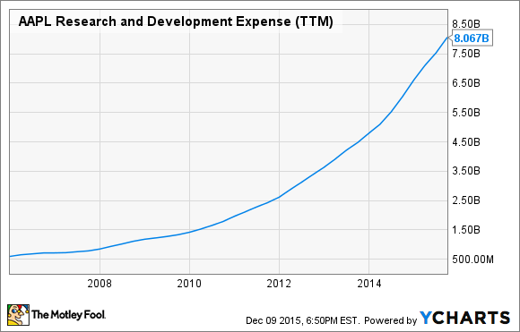 Apple has grown its revenue significantly over the last several years, which has allowed it to dramatically ramp up its research and development spending from where it was early on during the smartphone boom: