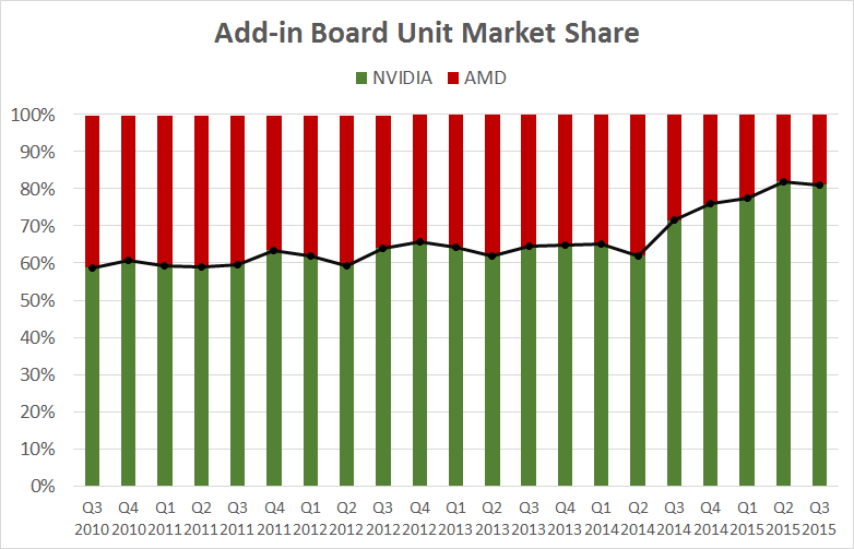 AMD has also had trouble in the GPU market. The company has been losing market share throughout 2015, and at the moment, NVIDIA claims a unit market share of about 80%.