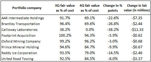 I built the table below to identify companies that were marked down, and to show how their valuations changed from last quarter to the current quarter. Medley investors should make use of the company descriptions that start on page 15 of its annual report to learn more about each portfolio company listed below.