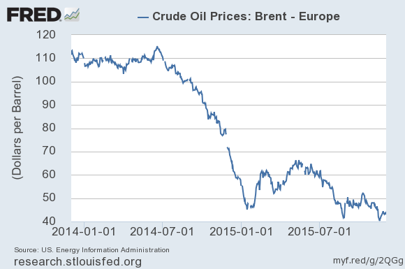 However, that number was incinerated in an oil fire during the second half of the year, with the price of a barrel having fallen by roughly a third to around $40 (see graph below). On Tuesday, the prices of Brent crude and U.S. oil futures broke below the $40 floor on an intraday basis, plumbing their lowest levels since Feb, 2009.