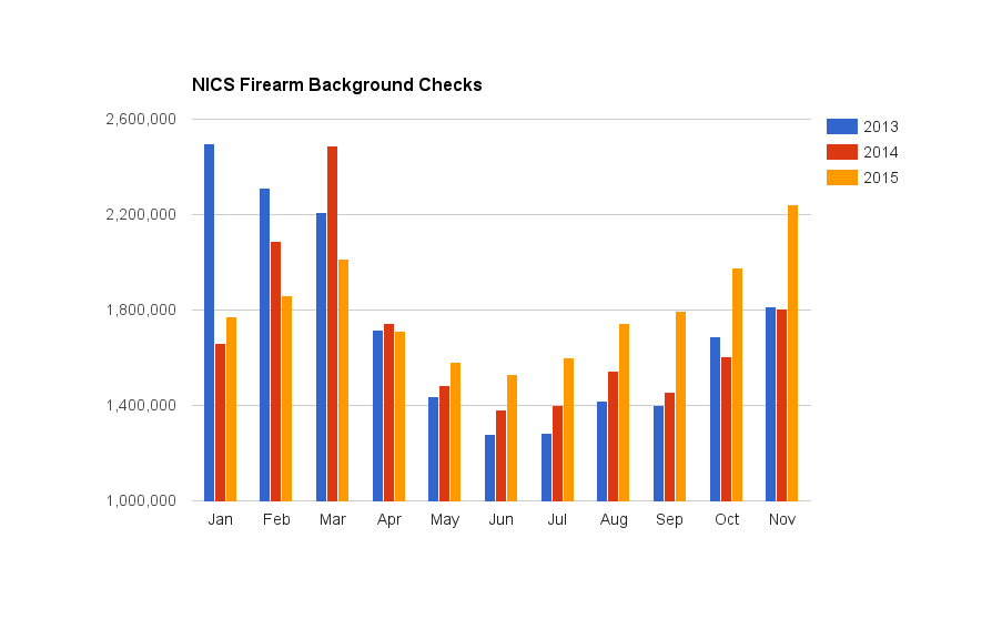 It's beginning to look like 2015 will be a year that smashes all previous records for firearms background checks. The numbers have grown sequentially in the back half of the year so that in November the FBI said it conducted over 2.2 million checks, the fourth biggest monthly total ever.