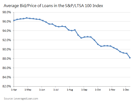 Bank loans have been on an almost continuous decline, with the average bid for the 100 largest loans declining since May 2015. This is a good proxy for the performance of the illiquid loans Apollo Investment Corporation invests in, and the loans that underlie its structured products holdings.