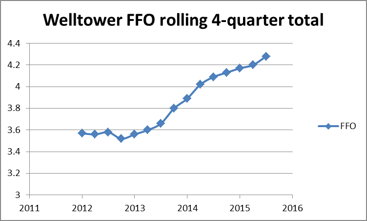 Welltower's funds from operations (or FFO, the earnings of the REIT world) have grown at a steady rate in recent years, and the company expects similar growth this year. For 2015, the company expects normalized FFO in the $4.32-$4.37 range, which represents an increase of 5%-6% over 2014. Since the historical dividend increase discussed earlier is within this range, the FFO growth certainly supports a higher payout, provided the positive FFO trajectory continues during the next few quarters.