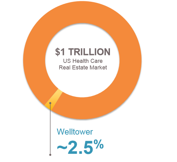Welltower is a leader in its business, but the market remains extremely fragmented. The U.S. healthcare real estate market is estimated to be approximately $1 trillion in size, and Welltower, the market leader, controls just 2.5% of that. In other words, there's tremendous room to pursue strategic acquisitions from the properties that exist right now -- not even counting the fact that demand will multiply in the coming decades.