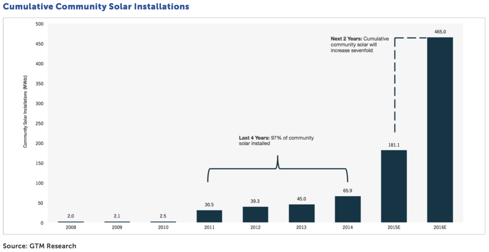 SolarCity knows this isn't a big market today, but sees it as a huge opportunity in the future. According to GTM Research, there were 65.9 MW of community solar installed in 2014 out of 6,201 MW installed in the U.S. But GTM Research believes that will grow to 465 MW in 2016, as companies like SolarCity start focusing on these projects.