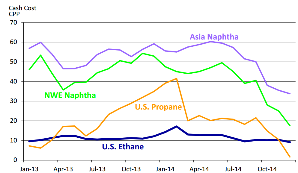 The boom in natural gas production across the U.S. has also led to an overabundance in ethane and propane, two base feedstocks that chemical manufacturers use commonly. Up until recently, many of the chemicals that can be made from these feedstocks have been using naptha and have been produced overseas. However, even when we consider how much oil prices have declined, the abundance of ethane and propane in the U.S. makes it a cheaper manufacturing option.