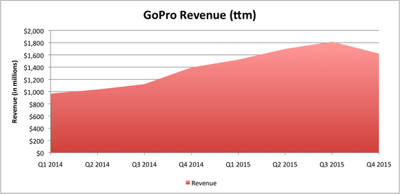 If direct sales are growing, it actually make sense that the number of retailers carrying GoPros is steady, if not falling, which could make GoPro's revenue fall even if end consumer demand is flat. With that in mind, look at the chart of GoPro's trailing-12-month revenue. It has some of the same characteristics as the channel-filling dynamic I pointed out above.