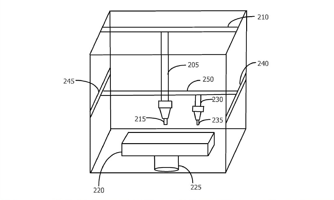 The primary thing that's unique about the printer in Apple's patent application is that it colors the object being printed while it's being printed. It accomplishes this via two nozzles -- one for extruding the material being printed and the other for applying the coloring agent or dye. The patent also contains an alternative method, which involves coloring the object after it's been printed.