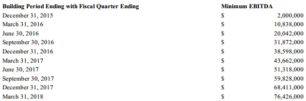 - Generating certain minimum quarterly EBITDA amounts beginning in Q4 2015.