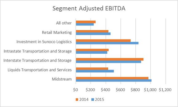 That said, we can largely dismiss the "all other" segment for two reasons. First, it holds a variety of the company's investments in other entities such as a refining joint venture and an entity that owns and operates coal handling facilities. Second, the main reason for the year over year drop is the fact that Energy Transfer Equity sold its investment in AmeriGas Partners (APU +0.00%) in August of 2014. In the first quarter alone the loss of AmeriGas Partners' contributions resulted in a $51 million year over year decrease in Segment Adjusted EBITDA from the all other segment.