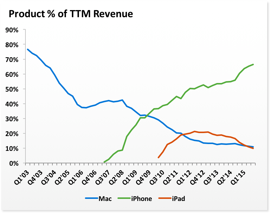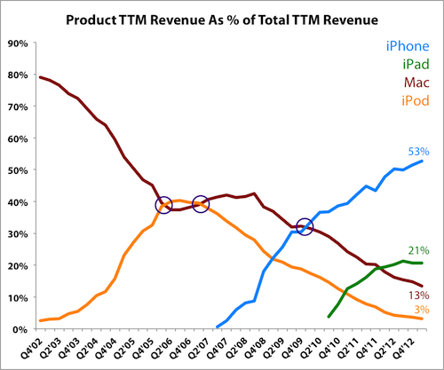 Meanwhile, I had observed that throughout Apple's history, different products have taken turns being the primary revenue driver over the years. Every time that Apple entered a new product category, that new product category would soon become the primary sales driver. The Mac, iPod, and iPhone each took their respective turns, although the iPod's turn was relatively short-lived. These inflection points came every few years, and I believed that the iPad was well on its way to becoming Apple's next big revenue driver.