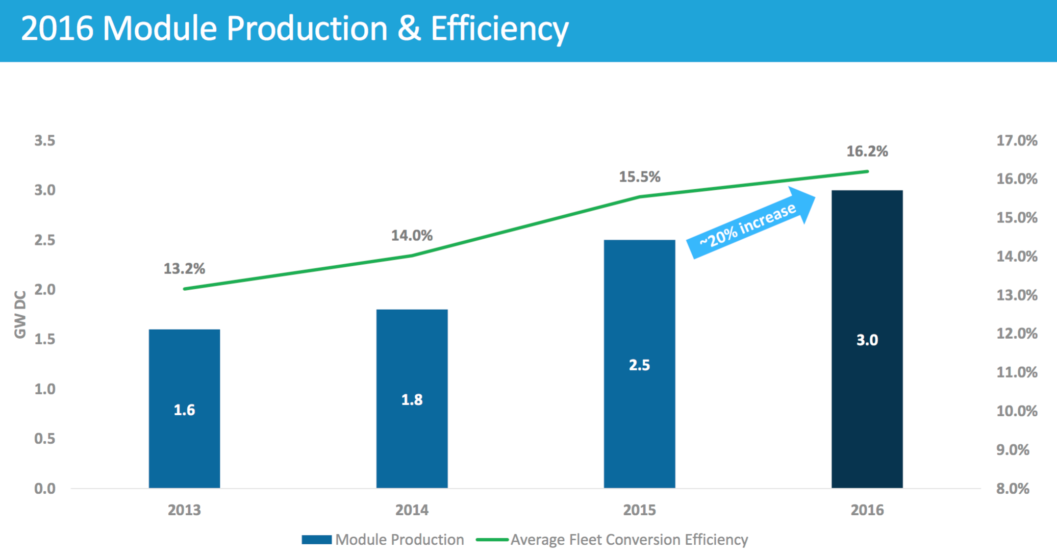When management recently announced 2016 guidance, it showed the improvements that are expected next year. Module efficiency is going to improve from 15.5% to 16.2%, and module production will grow 20% to 3.0 GW.