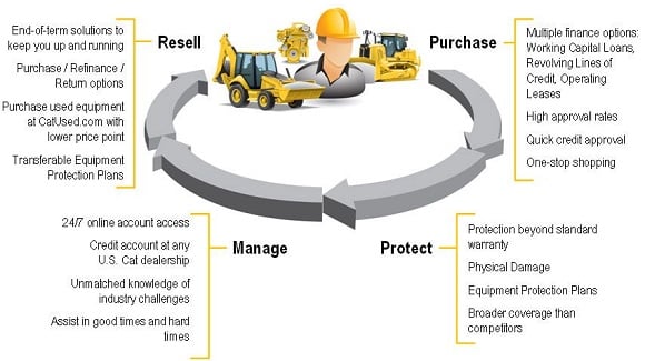 Caterpillar Financial offers options that regular sources of financing typically won't match. The working capital loans, revolving lines of credit, and operating leases that Caterpillar offers are similar to what you'll find from a host of other heavy-equipment operators, including Deere's (DE 1.15%) John Deere Financial. But customers can also get protection beyond a standard warranty for Caterpillar equipment, as well as equipment protection plans and physical damage insurance.