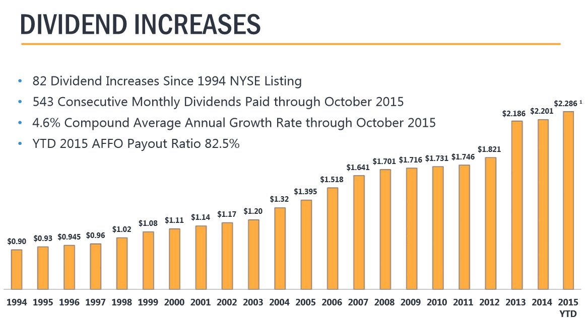 In addition, Realty Income continued its outstanding dividend history, having recently announced its 73rd consecutive quarterly dividend increase. In all, the dividend has grown by an average of 5% per year since the 1994 IPO.