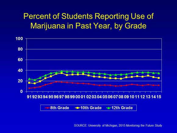 The bad news from the MTF study? Marijuana use among high school eighth, 10th, and 12th graders remained steady over a five-year period, with 6.5%, 14.8%, and 21.3%, respectively, admitting to smoking marijuana within the past month. A full 6% of high school seniors admit to smoking marijuana daily. Perhaps most surprising, just 31.9% of today's students view occasional marijuana smoking as harmful compared to 78.6% in 1991.