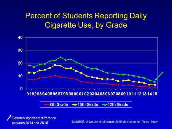 First, the good news: The percentage of students who smoke cigarettes and consume alcohol remains on a steady decline. Daily cigarette smoking is down to just 1.3% among eighth graders, 3% among 10th graders, and 5.5% for high school seniors. Five years ago, the daily smoking rates were 2.9%, 6.6%, and 6.7%, respectively. A similar decline was seen when past-month alcohol use was analyzed in eighth, 10th, and 12th graders.