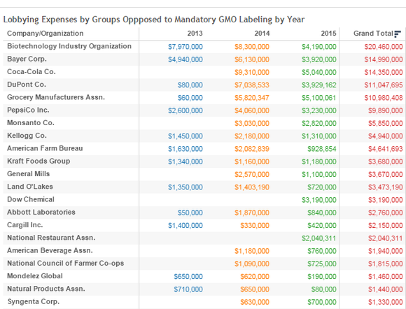 Is PepsiCo the next natural and organic, non-GMO champion? Hardly, it seems. Below is a chart of the largest lobbying expenditures by organization to defeat mandatory state and federal labeling of products containing GMO ingredients, according to the Environmental Working Group: