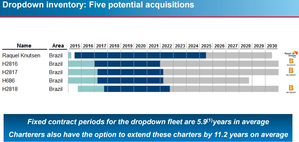 Meanwhile, offshore Brazilian oil projects have a breakeven price of around $40 per barrel. That's low enough for BG Group -- which Royal Dutch Shell (NYSE: RDS-A) (NYSE: RDS-B) is acquiring -- to have signed long-term contracts for three of KNOT Offshore's five potential dropdown candidates.