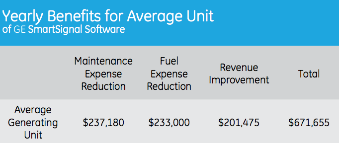 General Electric (GE 1.57%) presents customers with predictive-maintenance capabilities though its Predix-based, SmartSignal solution -- an ounce of prevention over a pound of cure. The company contends that the value proposition is well worth it; the average SmartSignal customer achieves ROI in six to 12 months. In the case of a power plant's fossil-fuel based generating unit, for example, the savings are substantial.