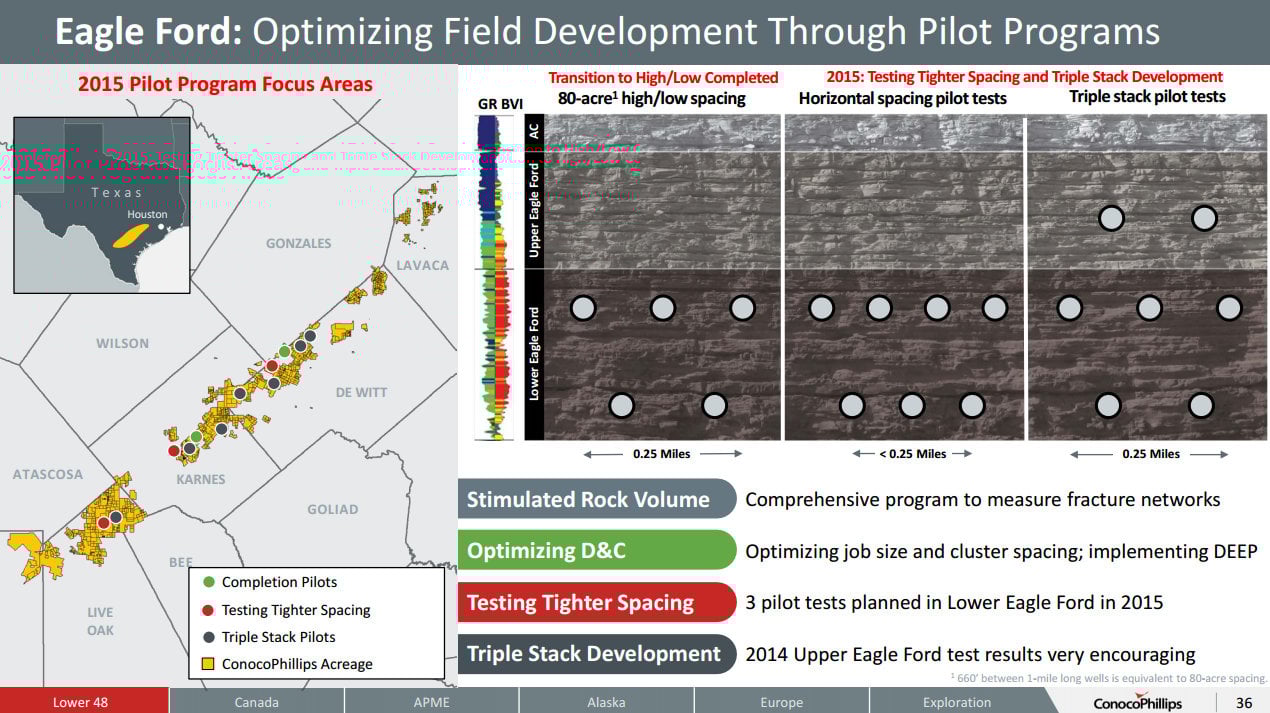 Helms remains optimistic about the Eagle Ford because it continues to grow in size due to the company's ability to maximize the recovery of hydrocarbons within its current acreage position. One of the newer techniques it is using (as are its peers) is known as a W pattern to drill wells into a section of the Eagle Ford. Fellow Eagle Ford driller ConocoPhillips (COP +5.96%) has a nice slide that details its spacing tests, including the W pattern: