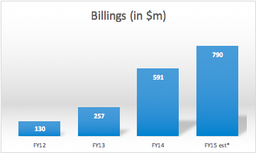 When a FireEye customer purchases a product, that customer is required to also buy a one- to three-year support and maintenance contract. FireEye bills the customer in advance. However, per accounting rules, FireEye doesn't recognize the revenue until it delivers the service over the life of the contract. Therefore, billings are a more accurate metric to evaluate the strength of new business. FireEye has grown billings more than fivefold over the past three years:
