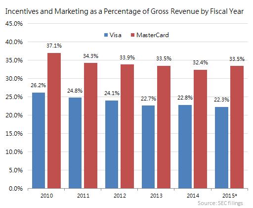 This chart not only captures more of Visa and MasterCard's spending to acquire customers, but it shows that total marketing spending as a percentage of gross revenue is falling. While incentives expenses are growing marginally, the impact is more than offset by declining marketing spend elsewhere.