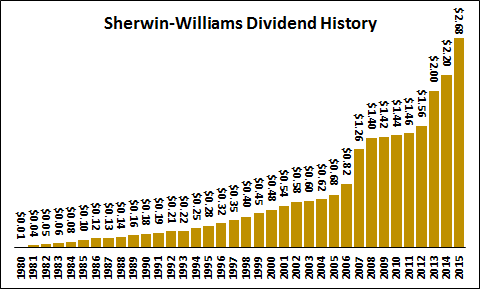 All of this suggests that in 2016, net income can rise at rates similar to this year's. Sherwin-Williams expects 2015 EPS to come in at $10.75 to $11.00. That puts its current valuation at 23.8 times the upper end of its forecast, which is not cheap, either relative to its own valuation history or to that of its manufacturing peers. If earnings grow at a comparable rate in 2016, it is trading around 20 times forward earnings -- not exorbitant by current standards, but hardly a bargain, particularly given the company's leverage: Shareholder's equity is only 16% of its balance sheet total. Sherwin-Williams has an enviable, 25-year record of increasing its dividend: