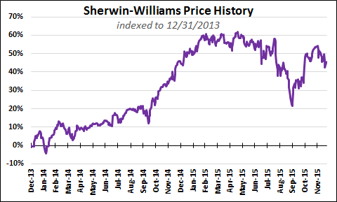 It still sells to big-box stores -- they contributed 14.5% of nine-month revenue. The margin on this revenue is currently about the same as that of the stores, and volumes are important: Paint manufacture requires scale and purchasing economies. The main raw materials are petrochemical resins and titanium dioxide. Pricing for both was favorable in 2015, and it will probably continue to be: TiO2 producers are attempting price increases, but they will be challenged to make them stick. The company reserves the "Sherwin-Williams" brand for itself, lending it exclusivity. The fact that the margin on sales to big-box customers is similar to store margin is not an indication of a flaw in the retailing strategy: Note that the stores sell a lot of painting equipment on which Sherwin-Williams captures only the retail margin.