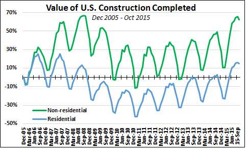 Although there is a large redecoration market, the biggest driver of architectural paint sales is new construction. Consequently, the outlook for this business in the U.S. is fairly good. While the housing recovery has been considerably less than overwhelming, nonresidential construction activity grew solidly in 2015, to within 0.6% of its 2008 peak, while residential construction seems likely to continue to improve, if not exactly boom: