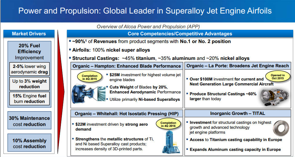 So the first good headline of the year was: "Alcoa Completes Acquisition of TITAL." The deal for this privately held titanium and aluminum aerospace parts producer was agreed to in December 2014. It was completed just three months or so later on March 3, a quick turnaround. The deal has a couple of important implications.