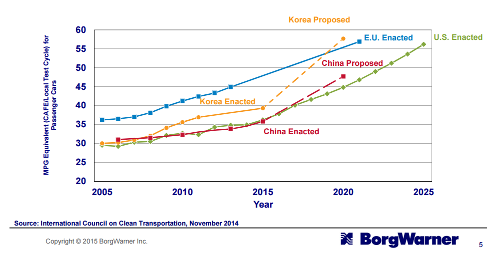 Thanks to many nations focusing on improving fuel economy, and regulations becoming more stringent, BorgWarner's future has upside. The company produces innovative powertrain solutions aimed at improving fuel economy, emissions, and performance.