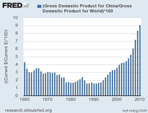Still, higher-quality (or rather, more balanced) growth or not, the slowdown is having global repercussions. The following graph shows China's contribution to global GDP, in percentage points, over the 50-year period spanning 1960 to 2010: