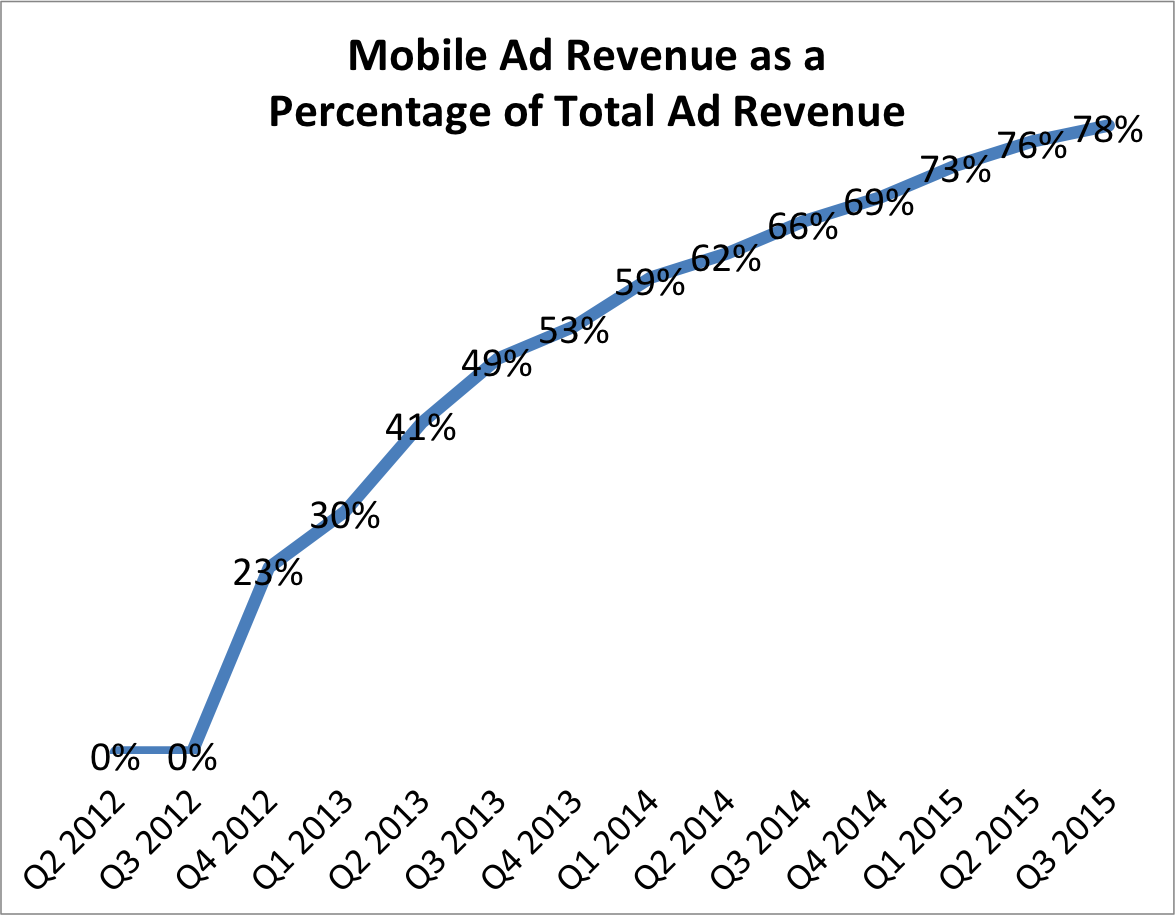 This trend continued into 2015 and is evident when examining Facebook's mobile ad revenue as a percentage of total ad revenue. While this figure may not be rising as rapidly as it was when the company first started rolling out mobile ads in 2012 and 2013, it's still steadily increasing.