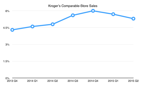Kroger has booked four straight quarters of greater than 5% comps gains. Data source: Company financial filings.