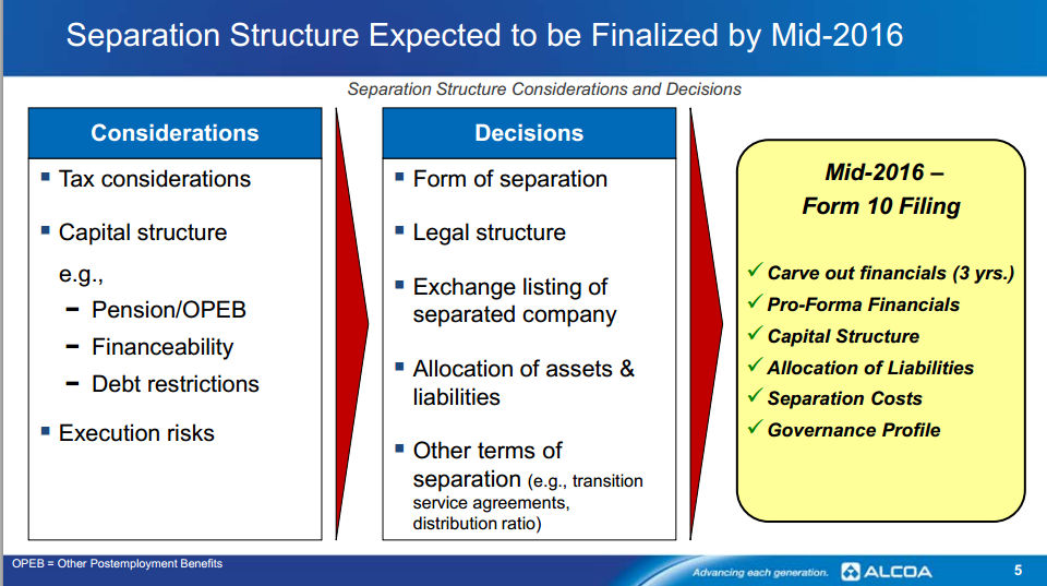 There are a lot of moving parts here. And there are a lot of connections between the two companies that have to be sorted out. For example, with upstream and value-add under one umbrella, Alcoa is a vertically integrated company. Basically, upstream makes the materials (aluminum) that value-add uses to make things like high-tech jet engine parts.