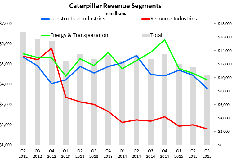 There's no question that 2015 has been a struggle for Caterpillar as demand for its heavy machinery remains bleak overseas. Weakness in mining materials, as well as the drastic plunge in crude oil prices, combined to be a strong headwind for its revenue.