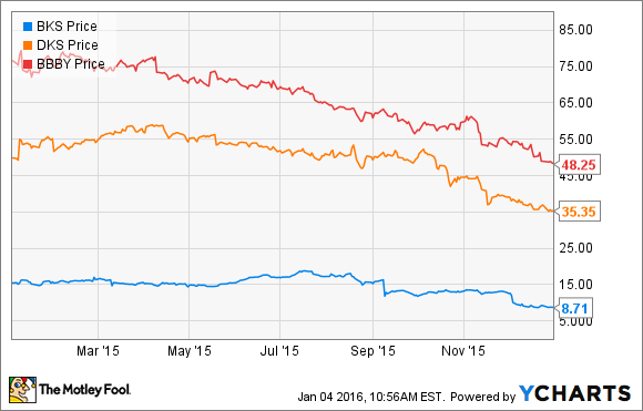 Three notable brands -- Barnes & Noble (BKS +0.00%), Dick's Sporting Goods (DKS 1.53%), and Bed Bath & Beyond (BBBY +0.00%) -- all had poor years during which their stock prices sank.