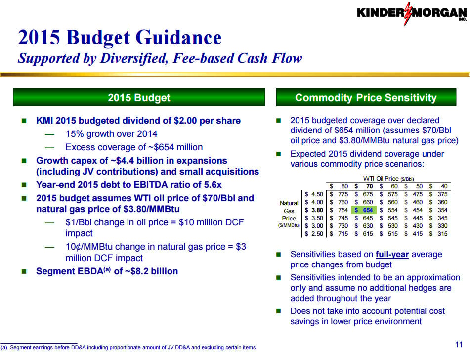 That being said, the issue that really started all of the concerns was Kinder Morgan's exposure to commodity prices. As the slide below notes, the company had expected to generate nearly $8.2 billion in segment earnings at a $70 oil price and $3.80 for natural gas, which would leave the company with $654 million in excess cash flow after paying a growing dividend in 2015.