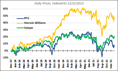 Since the companies are more similar, Valspar's performance relative to PPG is less easily explicable. Adjusting for PPG's 2014 disposals, its 2015 earnings performance has been stronger than Valspar's, yet they trade at similar valuations. Valspar has made some acquisitions, such as the Ace Hardware cooperative's own-brand paint operation in 2013, that are more visible to American analysts than, say, PPG's 2014 acquisition of Comex. Valspar is somewhat more oriented toward architectural paint and toward food packaging coatings (where it is the world's No. 1) than PPG (which is No. 2 in packaging coatings).