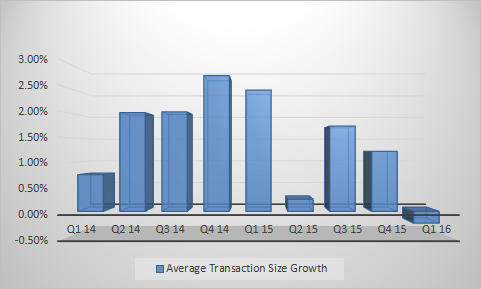 That said, there were signs of deterioration in the business. For example, average transaction size of $414 was flat sequentially and declined on a year-on-year basis -- particularly disappointing as the first quarter tends to see a sequential improvement in transaction size.