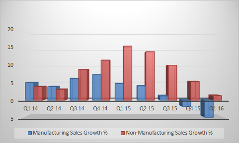 In addition, its non-manufacturing sales (around 30% of total sales) growth continues to decline even as manufacturing sales growth has been in negative territory for the last two quarters.