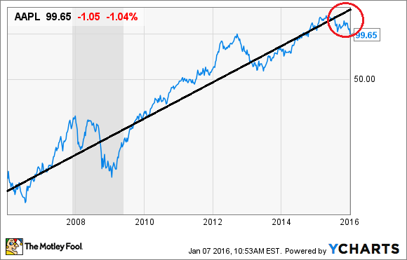 Shares of Apple dipped below $100 for the first time since August during yesterday's session, and as things stand, they are on track to close below that level today. Apple has not closed below triple digits since Oct. 2014.