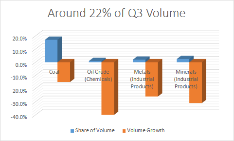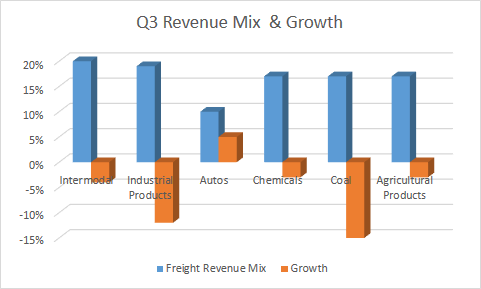 However, working on the arguments I've outlined, I decided to break out the volumes and volume growth thematically, starting with the individual elements heavily exposed to energy and hard commodity pricing. Clearly, the significant falls in energy and mining commodities have hit Union Pacific hard -- although East Coast railroad companies such as CSX have been hit harder because Appalachian coal is more expensive to produce.