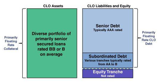 You can think of a CLO as something that mimics the workings of a bank. The CLO invests in loans to businesses. Instead of deposits, a CLO raises money from investors in the form of senior and subordinated debt. Below that is the equity slice, which gets all the "scraps" after the senior and subordinated debt investors receive their returns.