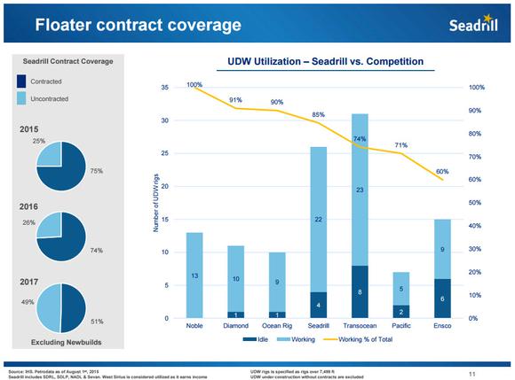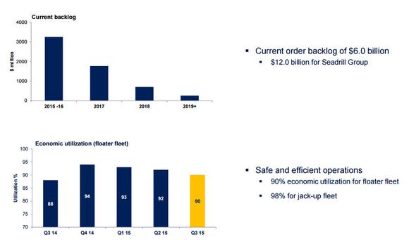 Although the backlog has decreased a bit, it remains plentiful at $14 billion for the Seadrill Group. Seadrill's stand-alone order backlog stands at about $7.5 billion. The floater fleet has contract coverage of 75% in 2015, 74% in 2016, and 51% in 2017. The jack-up fleet has contract coverage of 68% in 2015, 57% in 2016, and 32% in 2017. And the West Trellus and West Carina drillships started operations on a three-year contract with Petrobras in Brazil.