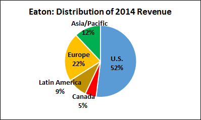 Times are tough for diversified industrials, and Eaton Corp. (NYSE: ETN) has not been spared. Its revenue capture is less geographically diverse than that of many of its peers -- it earned 52% of its 2014 revenue in the U.S. -- so that currency effects have been less painful for it than for others. For the full year it expects currency effects to reduce revenue by 5%.